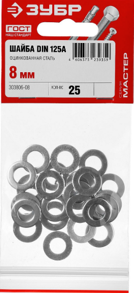 - Шайба DIN 125A, 8 мм, 25 шт, оцинкованная, ЗУБР