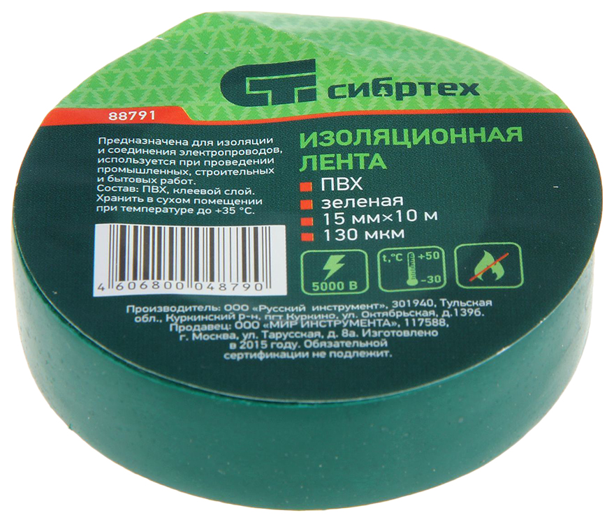 - Изолента ПВХ, 15 мм х 10 м, зеленая// Сибртех